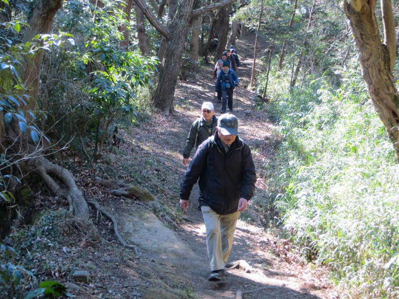 ◇参加者 11名(敬称略) 小倉通男、山本三樹夫、城市靖三、舩坂栄一、浅井信義、土居修治、平野 猛、加藤博紀、 新谷則雄、根井 淳、生江 勳 ◇メモ 朝10時、鎌倉駅東口に集合、雲一つない快晴で空気が澄み渡っている。朝礼後出発、長勝寺に向けて南東に歩を進め、途中常栄寺(ぼたもち寺:日蓮上人に「ぼたもち」を差上げた)に寄る、境内は紅梅が咲き始めている。次に安国論寺(日蓮布教のための庵)の前をとおり長勝寺に着く。長勝寺は鎌倉武士の石井長勝が日蓮のために建てた寺で、西郷隆盛像を制作した高村光雲作の日蓮の大きな銅像がある、なぜか日蓮が西郷隆盛に似ている。この近辺は日蓮ゆかりの寺が多い。 長勝寺を出ると横須賀線に沿って登り道になり名越切通(なごえきりどうし)に出る、鎌倉七口の一つでかなり狭い、いざ鎌倉の時には侍が身を屈め乍ら馬で駆け下りる姿が想像される。ここで北に歩を進め「まんだら堂」(鎌倉から室町時代の岩をくり抜いた墓群)へ向かうが調査中で立ち入り禁止、左に迂回する。お猿畠の大切岸(建築用石材を切り出した崖)で逗子方面の景色を堪能する。 次にパノラマ台(標高110m)へ向かう、急な階段をゼイゼイと息を弾ませ上ると快晴のなか360°景色が広がる。まずは雪を頂いた富士山に一同感嘆する、金時山、江の島、由比ヶ浜、鎌倉市内、大島等見放題である。次に衣張山(120m)に登る、相当疲労が溜まり、ここで昼食を摂り英気を養う。 ここも富士山ほかが堪能できた。何故か富士山を見ると得した気分になり今までの苦労を忘れる。集合写真を撮り下山する。途中ほとんどが階段で足を傷めないよう慎重に下りる。そこからバスに乗る誘惑を逃れるためにバス通りに出ずに田楽逗子の路を鶴岡八幡宮へ向かう。更に全員足で歩いて鎌倉駅に無事到着し解散した。歩数15,000歩で更にアップダウンがあり体感Bコースであったが富士山に癒された。 |