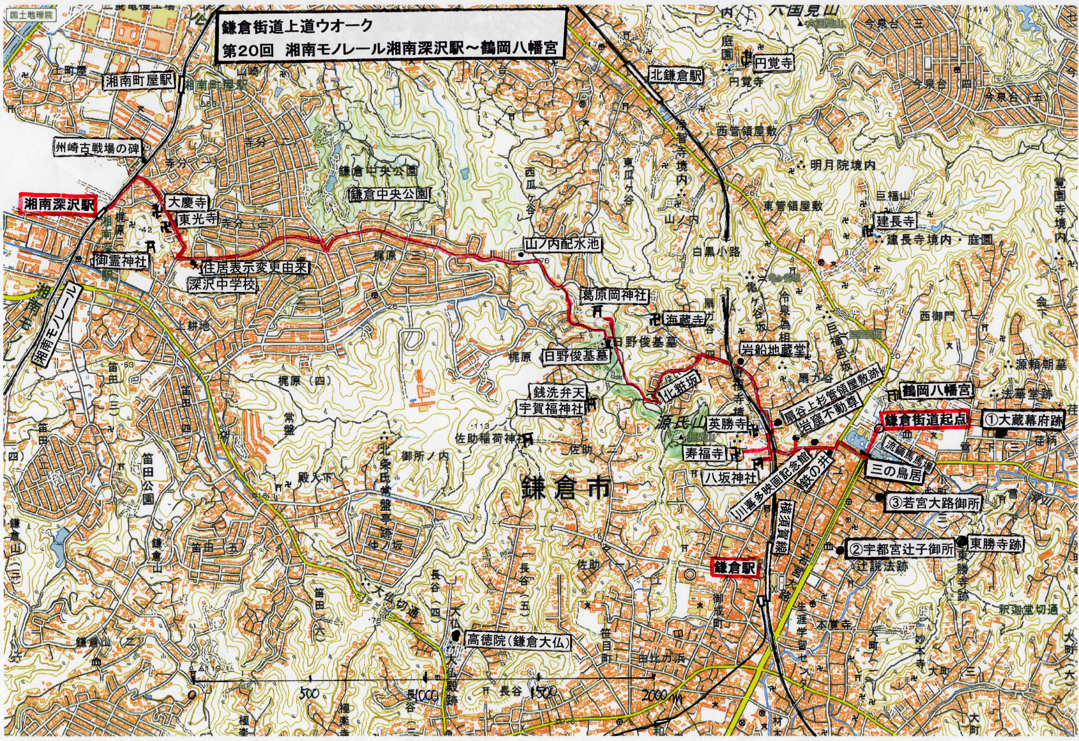 ★実施日 2019(H31)年2月20日(水)天候 晴 ★参加者 折本 文夫、前北 勝司、中田 信義、伊藤 泰弘、八木 閲三、相原 教男、宇山 治男、 杉田 勝行、三浦 繁雄、古家 計、竹島 久雄、 中島 征雄 計 12名 ★GPSデータ 歩行距離:7.7q 全体所要時間:3時間08分 移動時間:2時間14分 停止時間:54分。 移動平均速度: 3.41km/h。全体平均速度: 2.44/km/h。 累計歩行距離: 210.9km。 ★概要 心配された雨も未明には上がり、朝から晴天。モノレール大船駅で集合し、10時22分発に乗る。 集合人数11名。久しぶりに三浦さんと古家さんが参加。両名ともすこぶる元気。「洲埼古戦場」の碑を再 度寄るため予定の一つ手前の湘南町屋駅で下車。10:28、出発。古戦場の碑から坂を下り、富士塚小 入口信号を左折し、住宅地を進む。大慶寺(10:42)と東光寺の前を通り、突き当りの右への坂を上る。 坂上の丁字路を左折し、坂を上るとすぐの中学校正門の脇に「住居表示変更由来」の説明板がある。暑 くなってきたので一枚脱ぐ。(10:47) 住宅地の中の長い坂道を延々と上り、上り切った所のロータリーのような変則交差点を左折して、坂 を下る。上り返したところに山ノ内配水池があり、今度は坂を下る。下り坂の途中の右にある小道を入っ て(11:16)道なりに進むと、右下にあずまやが見える。直ぐに広い道に出ると行きかう人が増え、左に 「葛原岡神社」の鳥居が見える。(11:23) 「葛原岡神社」は後醍醐天皇の忠臣で、「元弘の乱」で鎌倉方に捕らえられ、ここ刑場があったこの葛 原ヶ岡で処刑された「日野俊基」を祀った神社。参拝後、神社の前のベンチがある広場で昼食とする。 (11:30〜51) 昼食後、「日野俊基の墓」に寄り、街道から外れ、予定になかった「銭洗い辨天」に向かう。急坂を下り、 坂の途中の洞窟をくぐると「銭洗い辨天」がある(12:05)。参拝客が大勢。さすが人気のスポット。参拝 し(12:11)、洞窟をくぐって先ほど下りて来た急坂を上り返し街道に戻る。「葛原岡神社」への道を左に 分け、「化粧坂」に向かう。「化粧坂」解説板の先から急で湿って滑りやすい「化粧坂」となる。一歩一歩慎 重に足場を確かめて降りる(12:18〜24)。この「化粧坂」は鎌倉街道上道の鎌倉への出入口である。 一気に4・50m降りると道路に突き当たるので右折。左に行くと海蔵寺がある。JR横須賀線のガード を潜った先に「岩船地蔵堂」がある12:32)。この地蔵堂は、源頼朝の娘で、木曽義仲の嫡男・義高の許 嫁の大姫を供養する堂。道なりに進み、線路沿いの細い道を進んだ先で道路に合流、すぐ左に「扇谷上 杉管領屋敷跡」碑がある。右の踏切を渡ると前に「英勝寺」、左隣に「寿福寺」がある。今日は時間の都合 上、寿福寺に寄れなかったのが心残り。 寿福寺前から踏切を渡り直進。川喜多映画記念館の中の通り道を通り、「鉄の井」を見て、鶴岡八幡 宮境内の西角を右折すると、観光客でごった返している「鶴岡八幡宮三の鳥居」がある(12:56)。 ここで、竹島さんが合流。集合写真を撮り、鎌倉街道上道の起点とした「流鏑馬馬場」へ行く。 13時02分、鎌倉街道上道起点(我々にとっては終点)の流鏑馬馬場に着く。 ここまで、今日歩いた距離は、6.5km。 2016(平成28)年11月16日(水)午前9時6分に高崎駅をスタート。全20回、209.7kmを歩き、今日2019(平成31)年2月20日(水)13時02分、鶴岡八幡宮に到着。お疲れ様でした。 この後、参拝し、若宮大路の東側の露地を歩き、「若宮大路御所跡」の碑、「宇都宮辻子御所跡」の碑を 訪ね、「打ち上げ会」の会場の山下飯店に向かう。歩き終わった山下飯店まで、今日歩いた距離は、7.7km。 歩いた全距離は、210.9km。 「打ち上げ会」会場の手配を全て八木さんにお願いしました。楽しい一時を作っていただいた八木さん には感謝し、御礼を申しあげます。 以上 以上